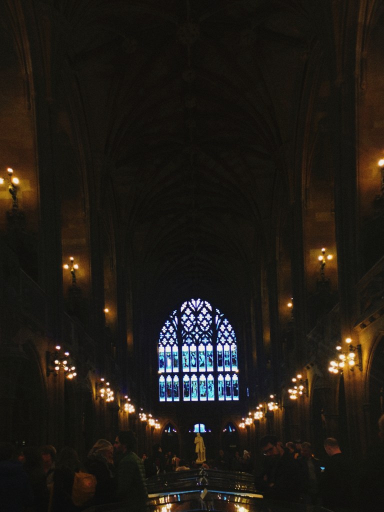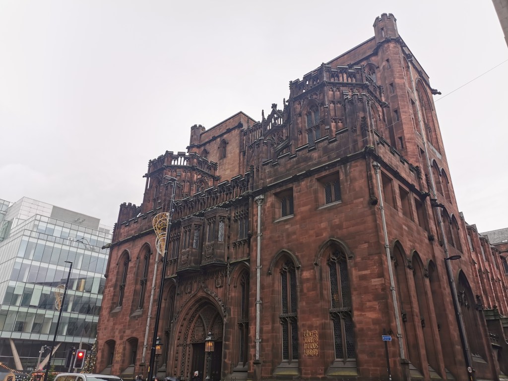 There are high windows containing brightly coloured glass, but it’s particularly thick. You can’t really see out of them. This wasn’t a very nice area in Victorian times so the idea behind that was not to see outside but still get light in. A way that you could escape from the outside world, really. The building was a gift for the people of Manchester.